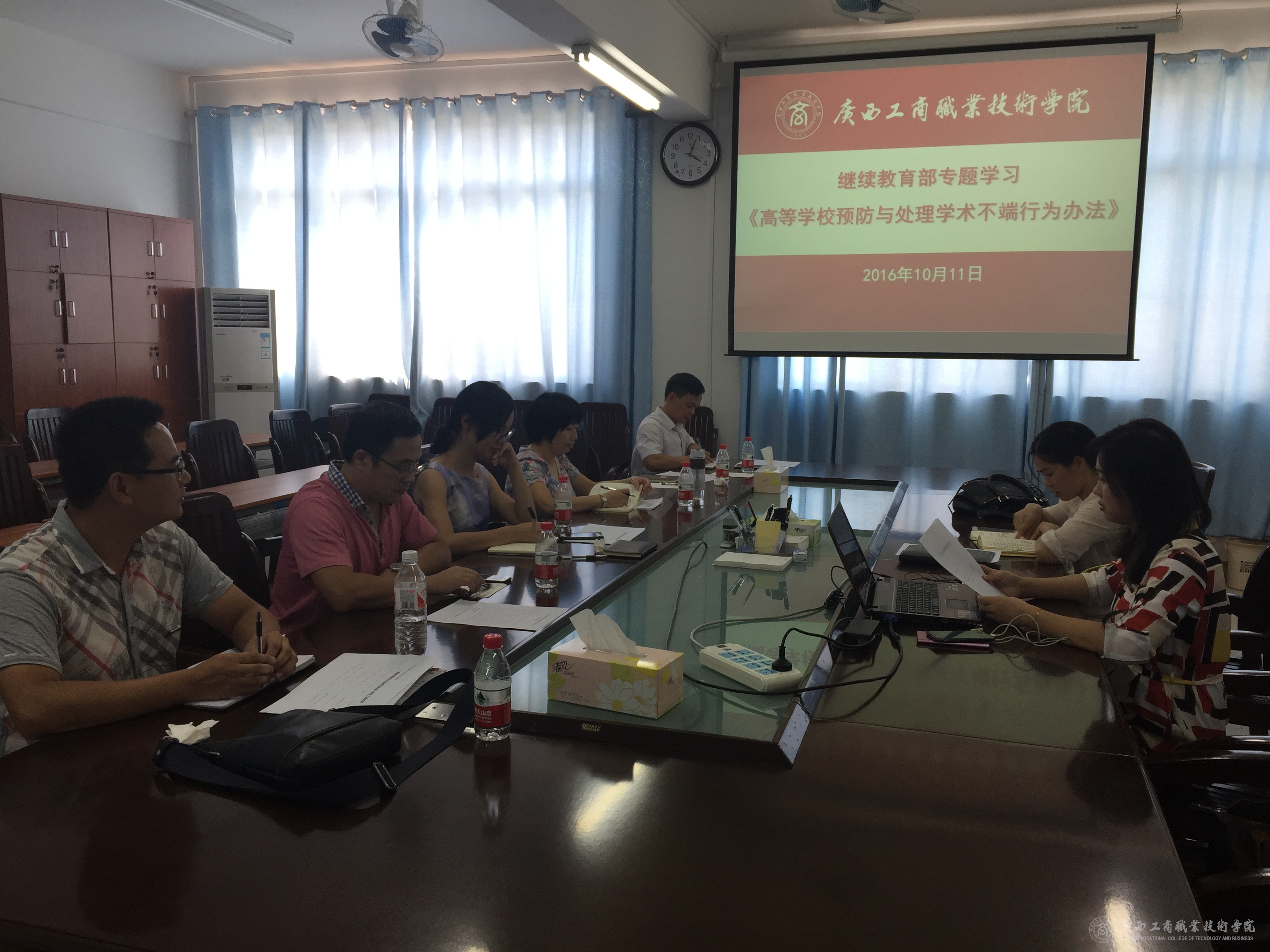 2016年10月11日下午,根据公司学习安排,继续教育部在本部2109会议室进行集体学习活动,组织部门全体成员学习《高等公司预防与处理学术不端行为办法》,学习采取集体学习与自学相结合的学习形式,集体学习由高洁主任主持。